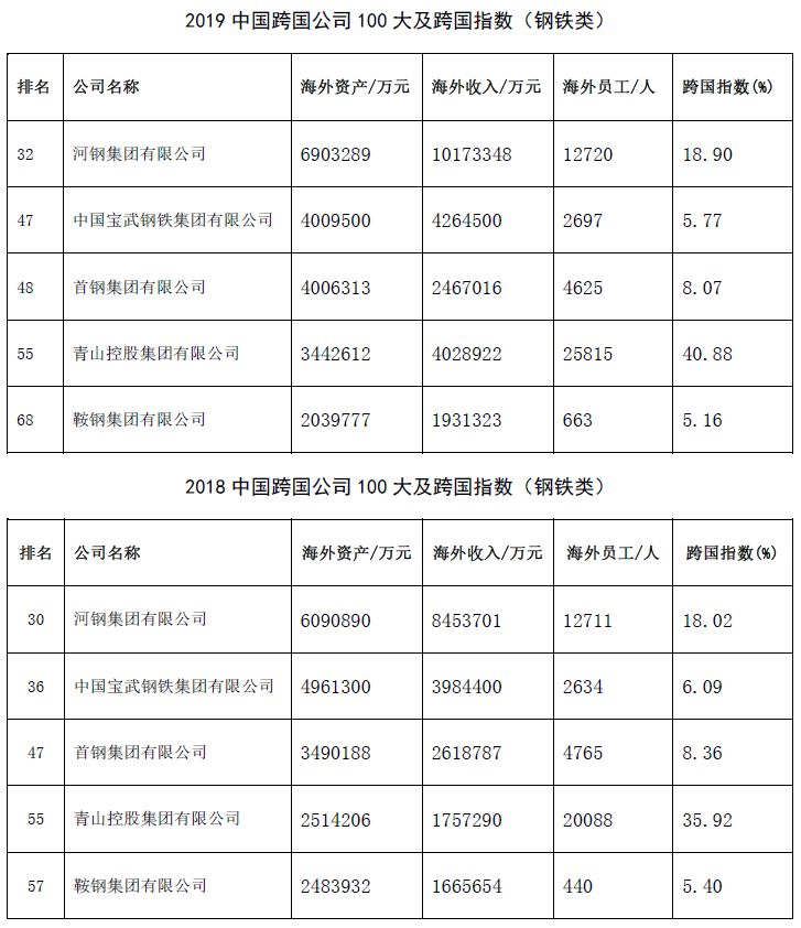 那究竟國內鋼鐵相關企業(yè)的國際化情況如何?根據(jù)中國企業(yè)聯(lián)合會、中國企業(yè)家協(xié)會日前發(fā)布的“中國100大跨國公司及跨國指數(shù)”,2019中國100大跨國公司的平均跨國指數(shù)為15.96 %,較上年提高0.16個百分點。但總體上看,中國跨國公司與世界跨國公司相比仍有較大差距。其中,有5家鋼鐵生產企業(yè)上榜,河鋼集團海外收入首次突破1000億元,為在海外收入最高的鋼鐵企業(yè),位列百強榜第32位,中國寶武鋼鐵集團、首鋼集團、青山控股集團和鞍鋼集團分列其后(見下表)。與2018年相比,除首鋼集團海外收入有所下滑外,其他4家企業(yè)海外收入均實現(xiàn)正增長。從跨國指數(shù)來看,2019年青山控股集團有限公司最高,達到40.88%,2018年為35.92%;河鋼集團為18.9%,比2018年的18%略有增加;寶武鋼鐵集團為5.77%,低于2018年的6.09%。