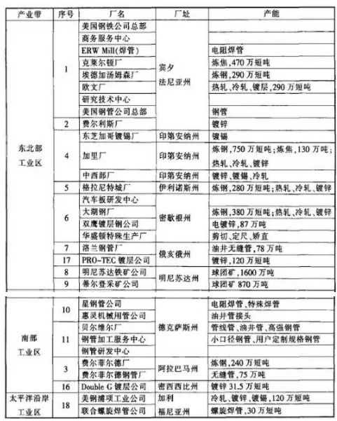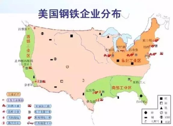 美國鋼鐵工業的誕生在東北部老工業區,集中分布了一批鋼鐵廠。臨近煤礦和鐵礦,利用美國和加拿大之間的五大湖水系運輸鐵礦到匹茨堡,后來才發展起強大的機械制造業。