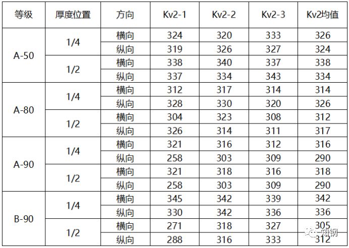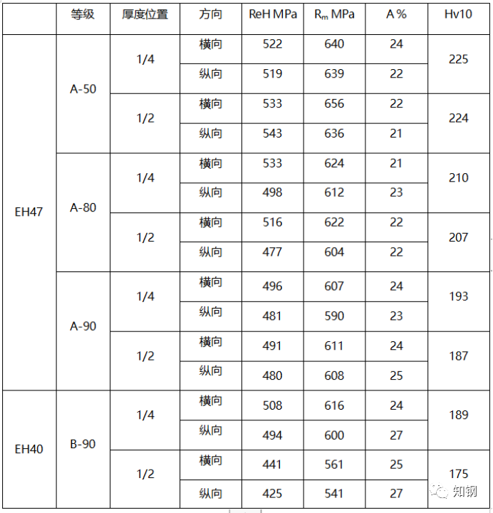 可見,無(wú)論是50mm厚、還是80mm、90mm厚的EH40、EH47厚板鋼的強(qiáng)度性能及硬度性能均滿足規(guī)范標(biāo)準(zhǔn)的要求,并且具有一定的富余量。采用同一成分A軋制的EH47、厚度分別為50、80、90mm厚度的鋼板,可以看出隨著厚度增加,強(qiáng)度有下降,同時(shí)在板厚度1/2和1/4處的強(qiáng)度差異略有增加。但硬度上的差異比較明顯,同一成分軋制不同厚度的鋼板,硬度最大相差30Hv10。而不同成分軋制的EH40、EH47的90mm厚鋼板,由于EH40有更低的Ceq,強(qiáng)度、硬度低于EH47同等厚度鋼板。