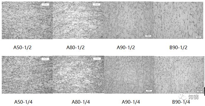同時(shí),由于厚度的差異,80mm、90mm厚的鋼板的板厚度1/2和1/4的強(qiáng)度性能有一定差異,這種差異在微觀組織上也有一定的表現(xiàn),如圖1所示。由于變形在厚度方向的不均勻分布及冷卻強(qiáng)度的不同,越接近鋼板表面的組織越細(xì)小,針狀鐵素體的比例也越高。這種組織上的差異影響了力學(xué)性能。