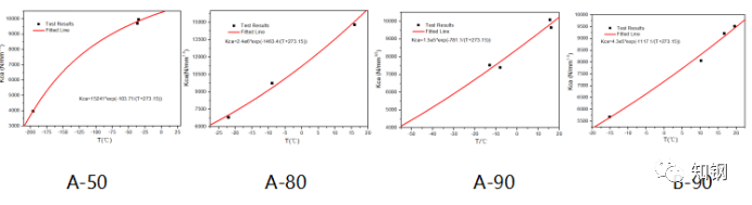 表1為試制的EH40、EH47厚板的低溫夏比沖擊性能的結(jié)果。根據(jù)檢驗(yàn)結(jié)果,可以看出A、B兩種成分的鋼、應(yīng)用同一成分A軋制的不同厚度EH47鋼板在-40°C時(shí)都具有較高的沖擊功,最低也在260J以上,由于軋制壓縮比不同,隨厚度的增加沖擊功略有下降。不同Ni含量相同厚度規(guī)格的EH40、EH47在-40°C時(shí)的沖擊功大小差別不大,沖擊功轉(zhuǎn)變曲線的上平臺(tái)幾乎沒(méi)有差別。但由于壓縮比不同及Ni含量不同導(dǎo)致的低溫韌性差異在夏比沖擊的連續(xù)溫度韌脆轉(zhuǎn)變曲線和隨后的雙重拉伸測(cè)定Kca數(shù)值的試驗(yàn)中表現(xiàn)明顯。這也就是為什么不能單純用低溫夏比沖擊功來(lái)衡量止裂鋼的低溫性能的原因。