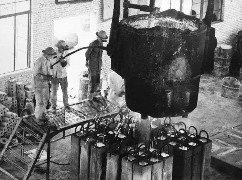 ▲建廠初期,采用人工喂料方式進行軋鋼生產 ▼生產出來的鋼水采用鋼錠模澆筑鋼錠