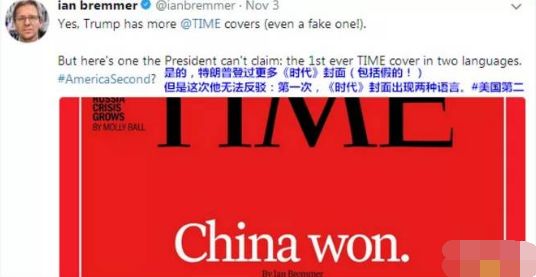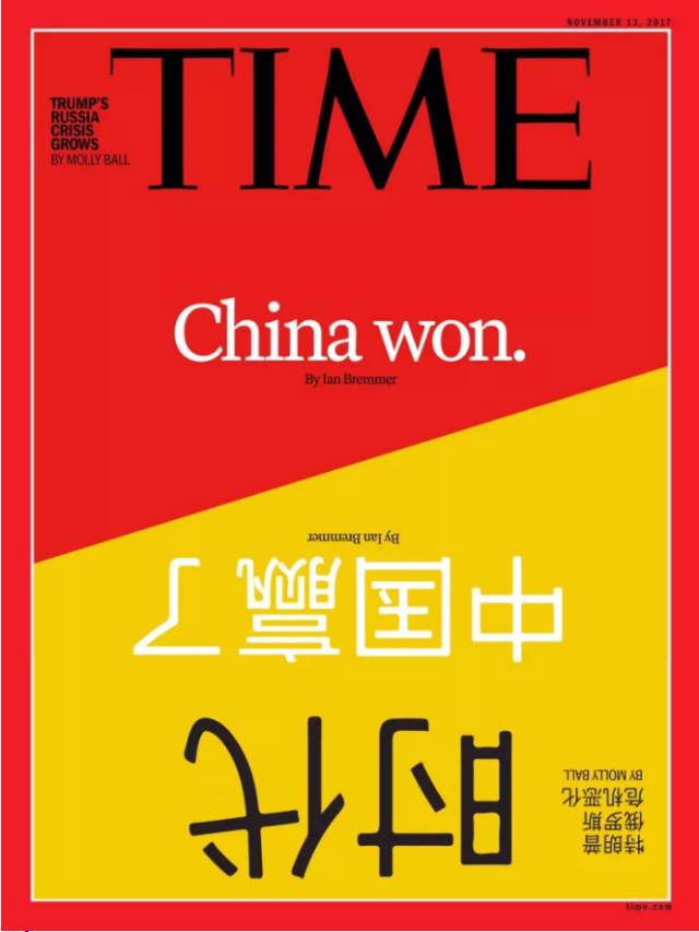 正如去年美國《時代》周刊,公布的一期的雜志封面。雜志封面用中文和英文兩種語言,寫“中國贏了”(China Won)。