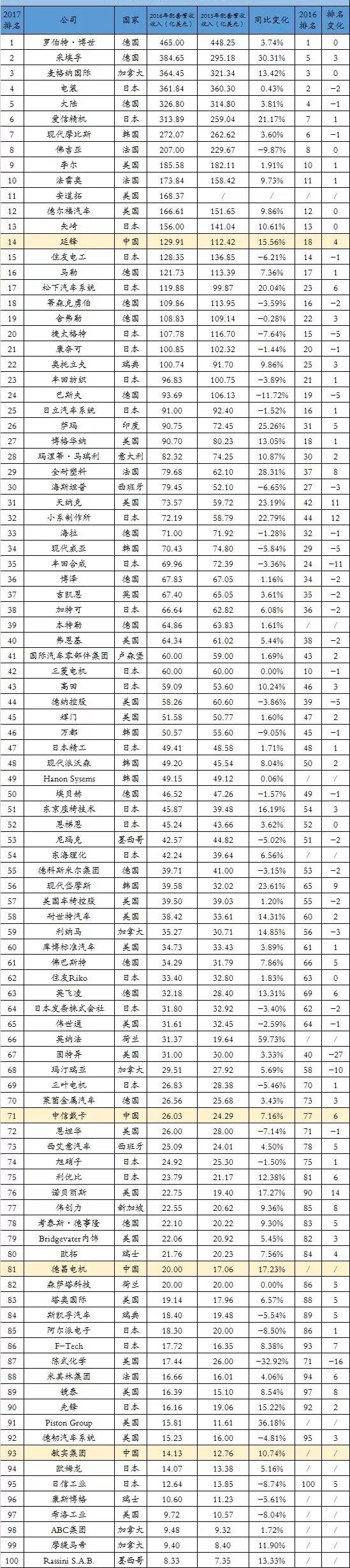 附 2017年全球汽車零部件供應商百強榜