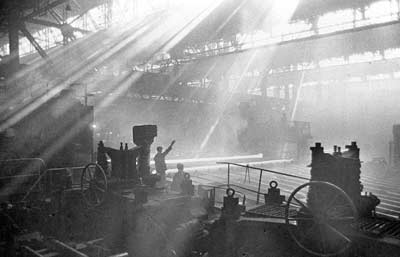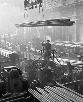 我國第一根無縫鋼管的管坯經過穿孔機后,正走向軋管機