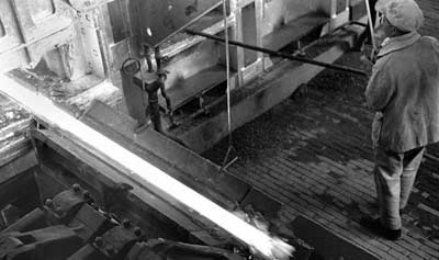 中國歷史上第一根無縫鋼管的管坯正從1200度高溫的加熱爐里吐出來