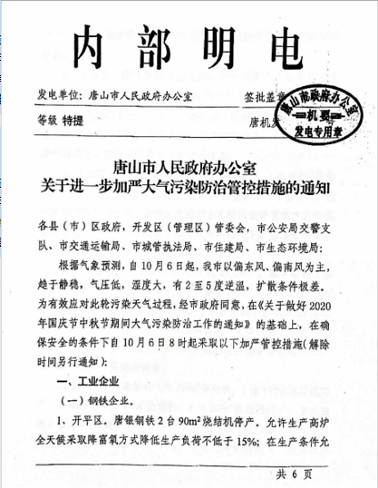 唐山市關(guān)于進一步加嚴大氣污染防治管控措施的通知。各縣(市)區(qū)政府,開發(fā)區(qū)(管理區(qū))管委會,市公安局交警支隊、市交通運輸局、市城管執(zhí)法局、市住建局、市生態(tài)環(huán)境局:根據(jù)氣象預(yù)測,自10月6日起,我市以偏東風、偏南風為主,趨于靜穩(wěn),氣壓低,濕度大,有2至5度逆溫,擴散條件板差。為有效應(yīng)對此輪污染天氣過程,經(jīng)市政府同意,在《關(guān)于做好2020年國慶節(jié)中秋節(jié)期間大氣污染防治工作的通知》的基礎(chǔ)上,在確保安全的條件下自10月6日8時起采取加嚴管控措施(解除時間另行通知)。