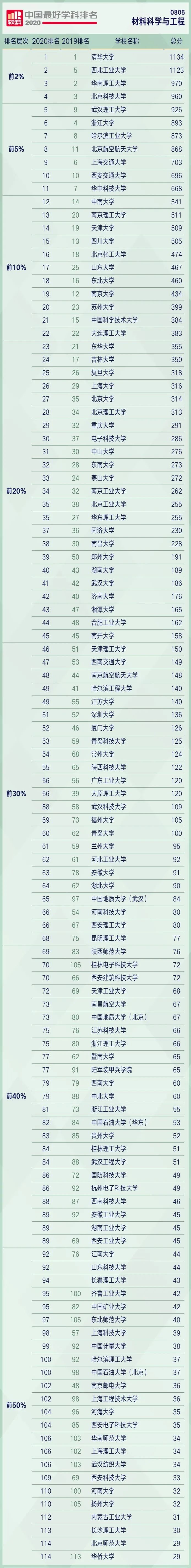 高等教育評價專業機構軟科今日(10月15日)正式發布“2020軟科中國最好學科排名”,排名榜單包括96個一級學科。材料科學與工程學科排名共有115所大學上榜,清華大學、西北工業大學、華南理工大學、北京科技大學位列前2%。完整排名名單如下: