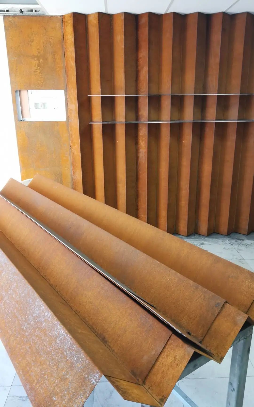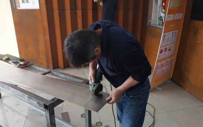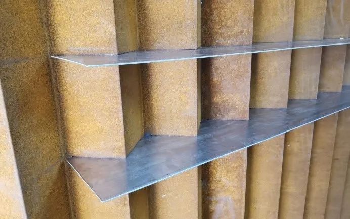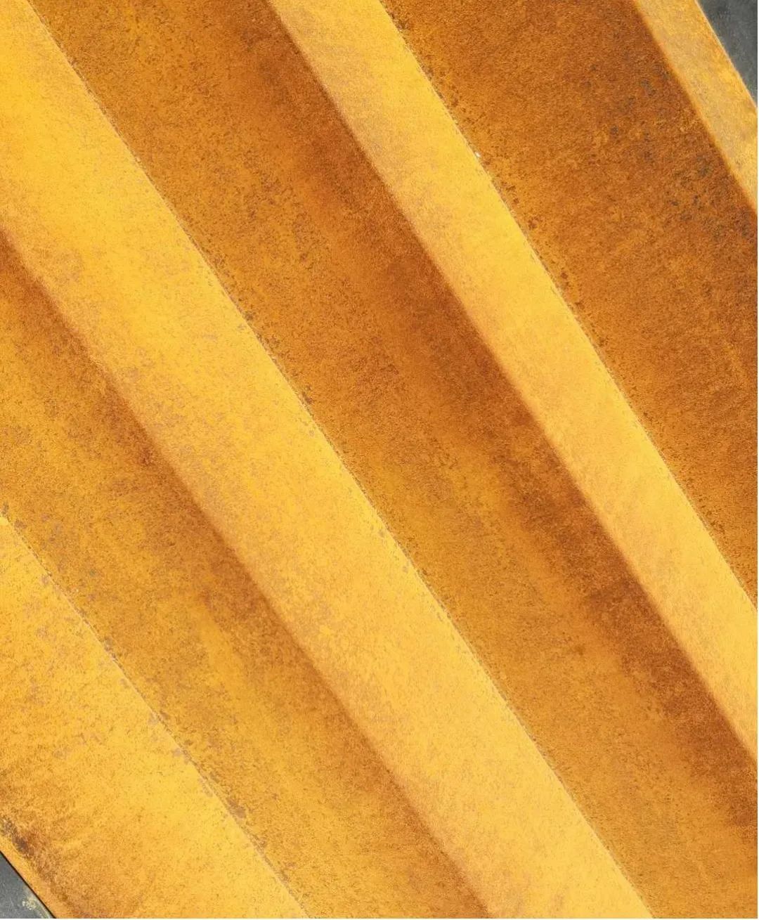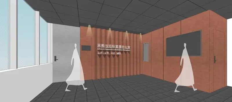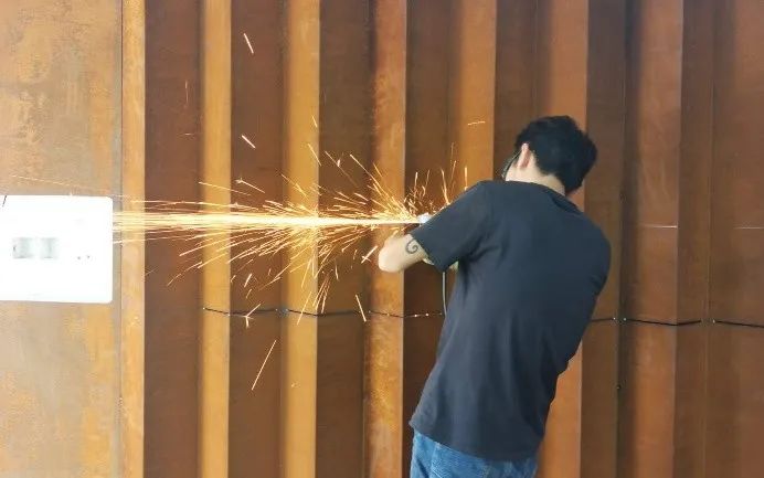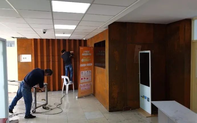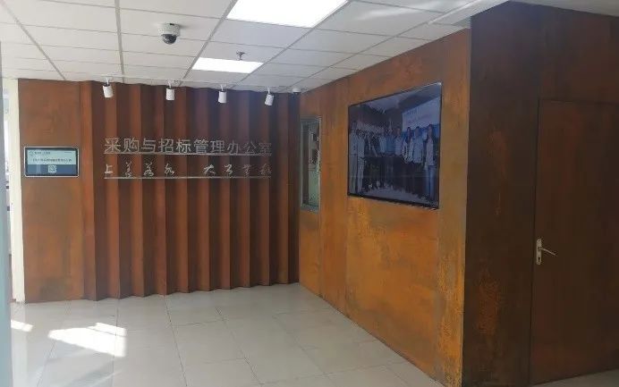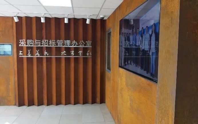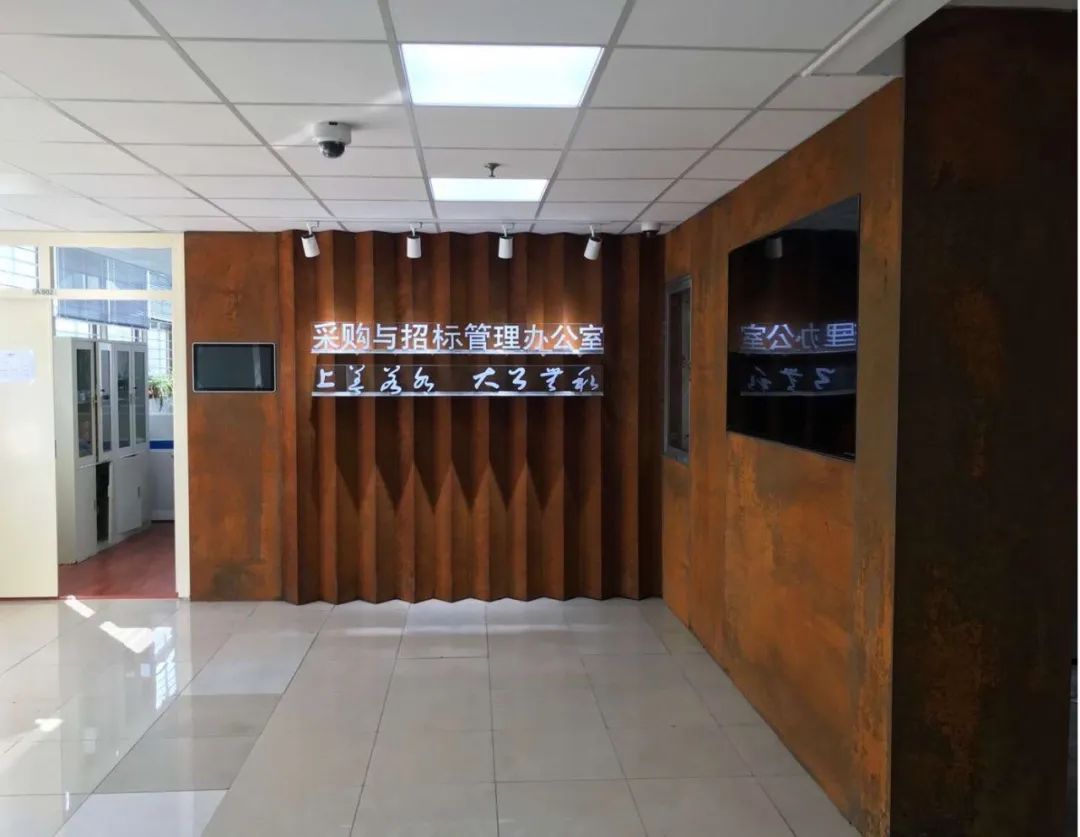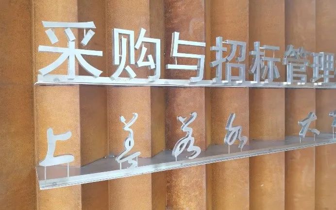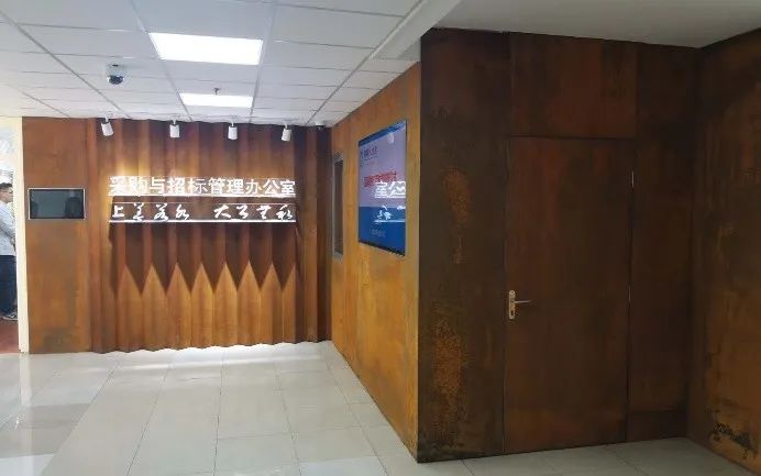 鋼鐵材料以其獨特的色彩也被藝術家和設計師應用,并表現出不一樣的思想意境。上海大學總會計師茍燕楠教授構思了在采購與招標管理辦公室的裝飾上考慮銹蝕鋼鐵材料與明亮不銹鋼材料的強烈色彩反差,采用上海大學老校長于右任的“上善若水,大公無私”字體,體現出采招辦的“拒腐蝕,永不沾”的工作原則;總設計師王海松教授的創意設計充分體現出這一理念;材料學院董瀚教授領銜的高性能鋼鐵材料團隊(ABC Iron & Steel Tech)在鋼企的大力支持下,提供了創新的稀土耐蝕普碳鋼薄板和抗菌毒不銹鋼板材用以實現并突出上述構思與設計。