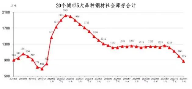 中鋼協最新數據顯示,11月中旬20個城市5大品種鋼材社庫875萬噸,較上一旬減少128萬噸,降幅達到12.8%,下降幅度呈現擴大趨勢。需要持續關注11月下旬降庫情況,有放緩的壓力。