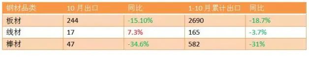 海關總署最新數據,10月我國鋼鐵板材出口244萬噸,同比下降15.1%。1-10月累計出口2690萬噸,同比下降18.7%。較上個月降幅收窄,隨著國際和國內鋼材價差收窄,出口降幅放緩,但疫情對出口的影響仍在,短期出口下降難有方向上的改變。