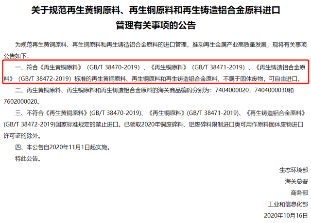 10月,生態環境部、海關總署、商務部、工信部發布《關于規范再生黃銅原料、再生銅原料和再生鑄造鋁合金原料進口管理有關事項》的公告稱,符合《再生黃銅原料》、《再生銅原料》、《再生鑄造鋁合金原料》標準的再生黃銅原料、再生銅原料、再生鑄造鋁合金原料,不屬于固體廢物,可自由進口。