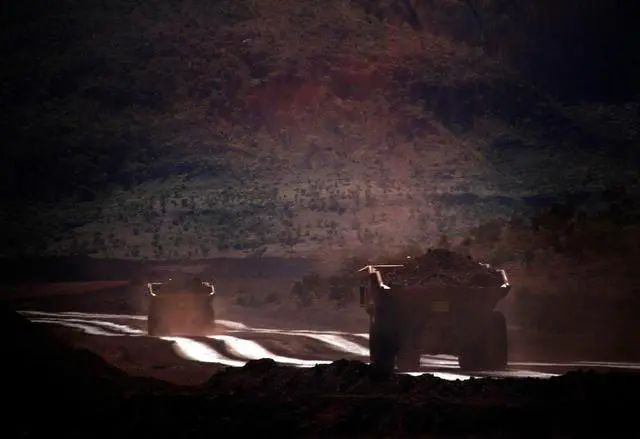 ▲澳大利亞主要鐵礦產(chǎn)區(qū)西澳大利亞州皮爾巴拉地區(qū),卡車滿載鐵礦石沿著公路向黑德蘭港行駛