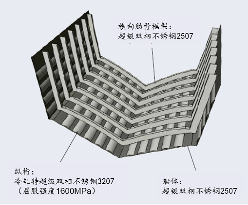 如果采用比傳統的碳鋼材料強度高可達三倍的不銹鋼來造船,可以大大減薄船體的厚度,從而減輕整艘船的重量。但問題是,在通常的船舶設計中,薄薄的鋼板無論強度多高,都容易在波浪載荷下發生彎曲。