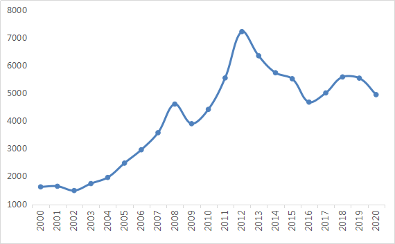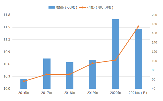 另根據(jù)國際期貨行業(yè)協(xié)會(Futures Industry Association(FIA))統(tǒng)計的2020年全球期貨成交量數(shù)據(jù)顯示,中國的大商所位居全球交易所期貨和期權成交量排名第7位,其鐵礦石期貨交易則以284,630,172手(折合284.63億噸)位居全球金屬期貨交易的第3位(2019年鐵礦石以29,658,011手(折合296.58億噸)位列次席)。2020年,大商所的鐵礦石相關期貨(權)成交量和成交額則高達284.63億噸和21.59萬億元,由此計算的2020年大商所鐵礦石期貨價格平均價格為109.9美元/噸。而2020年全年普氏鐵礦石價格指數(shù)的平均值為108.9美元/噸,相差無幾。