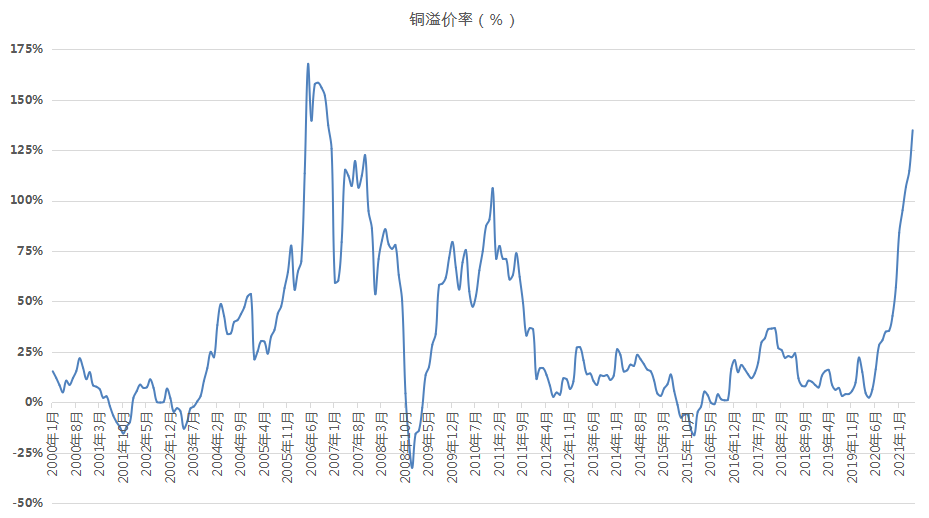 相對于銅市場的整體供需格局以及銅的資源方的國家分布、抗疫能力等特點以及中國鋼鐵工業(yè)在抗疫期間的絕對“優(yōu)秀”表現(xiàn),優(yōu)質鐵礦石資源高度集中于澳大利亞的特點被更多的資本所青睞,鐵礦石溢價水平逐漸偏離銅的溢價水平,鐵銅溢價相關度也由2020年3月的98.4%逐月下降至2020年12月的90.2%(相當于2018年4月水平),以后隨著銅價的上升帶動銅成本溢價的提高而逐漸恢復至95.9%水平。