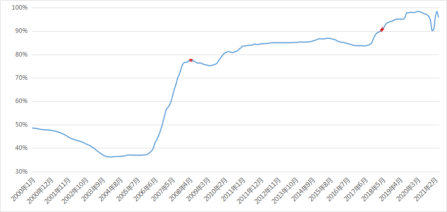 階段一:2006年1月以前的鐵銅溢價水平相關度數(shù)值均低于50%。而這一階段對應的是當時的鐵礦石的價格由日本為代表的“六大高爐鋼廠”與當時鐵礦石三大礦商(淡水河谷、力拓、必和必拓)通過談判確定鐵礦石價格,史稱“長協(xié)價格”。此階段由于日本銀團參股了三大礦商,因此日本在鐵礦石的價格決定上具有相當?shù)脑捳Z權。而由于銅在當時充分市場價格決定的情況下,鐵與銅的價格成本溢價相關度勢必有較大出入,鐵礦石價格已不能反應市場的供需變化。這也充分印證了在中國鋼鐵工業(yè)迅速崛起的這一階段,當時的全球三大鐵礦商為何全力摒棄長協(xié)談判的原因。 階段二:2006年1月至2008年5月,鐵銅溢價水平相關度迅速升至70%以上水平。在此期間內,在長協(xié)價格被市場廢棄并采取短期價格談判的方式?jīng)Q定鐵礦石價格,鐵礦石商品的話語權從需求端(日本六大高爐鋼廠為主)的話語權極大向供需博弈過渡。從鐵銅溢價水平相關度變化上看,鐵銅溢價水平迅速由37.3%提高至77.5%的水平,反應了短期談判價格一定程度上對市場價格的反應程度。鐵礦石溢價水平相關度的提高,反應出全球鐵礦石三大礦商不斷追求高額回報的愿望,也支撐了他們繼續(xù)尋找、選擇更能體現(xiàn)市場價格的定價策略以獲得更高的成本溢價,在此情況下,鐵礦石普氏價格指數(shù)(PLATTS IRON ORE INDEX)應運而生。 階段三:2008年6月至2018年4月,鐵銅溢價水平相關度上升至90%左右水平。此階段對應鐵礦石市場定價的突出特征是充分體現(xiàn)和滿足了全球鐵礦石生產(chǎn)巨頭全面需求利益的普氏價格問世,并被鐵礦石供方選中成為行業(yè)內定價依據(jù)。由于中國對鐵礦石的強勁需求和四大礦商的絕對比例的資源壟斷地位,自普氏指數(shù)成為鐵礦石定價依據(jù)以來,鐵礦石市場體現(xiàn)出了以四大礦山為價格主導的市場供需定價機制。市場定價機制的導入使得鐵礦石的價格更具有市場決定因素,從而推高了鐵銅溢價水平的相關度由77.5%上升至91.1%。 階段四:2018年5月至今,鐵銅溢價水平相關度始終保持90%以上水平。2018年5月,大商所引入境外投資者后,大商所鐵礦石期貨金融屬性在國外資本的推動下迅速增強,此階段的鐵礦石在其鋼鐵原料領域已經(jīng)具備了與銅在有色金屬領域的完全相同的所有特征。在金融屬性的助力下,鐵銅溢價相關度一度達到98.4%(2020年3月)。