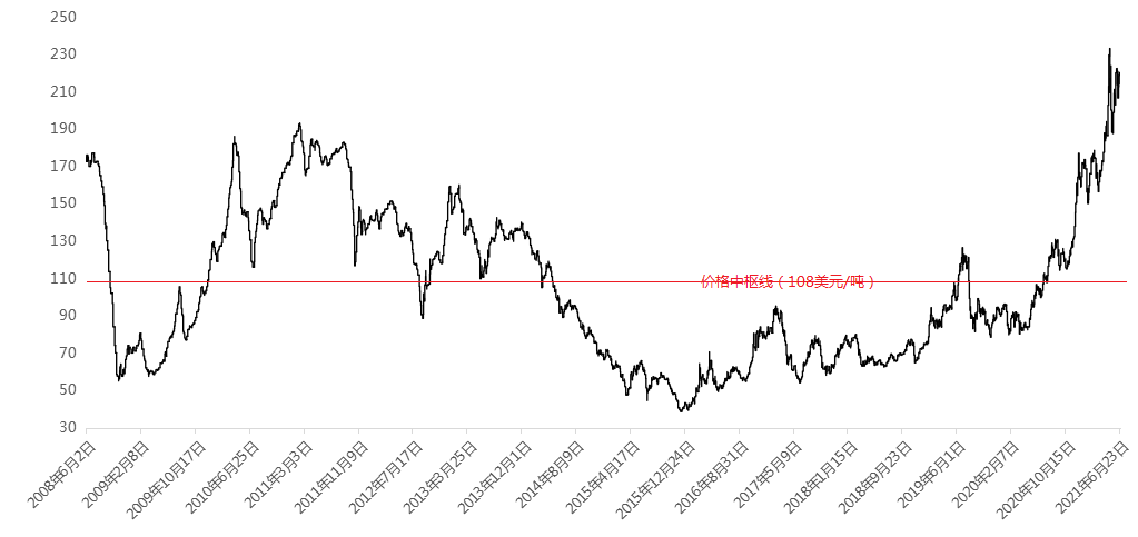 2018年5月至2021年6月期間內的普氏鐵礦石價格指數(shù)均值為108.2美元/噸。同期普氏鐵礦石價格指數(shù)的平均價格為105.2美元/噸、區(qū)間內普氏鐵礦石價格指數(shù)的標準差41.2美元/噸,即價格在64美元/噸至146美元區(qū)間均屬數(shù)據(jù)的正常分布。