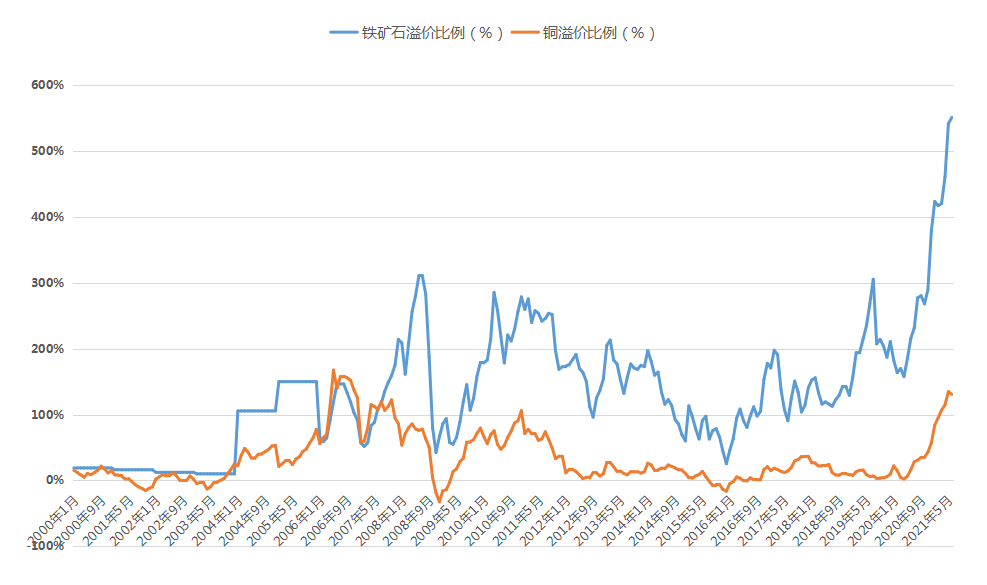 數(shù)據(jù)分析顯示:2000年以來,鐵礦石與銅在成本溢價方面的相關度越來越高,且在2018年5月后相關度水平始終高于90%以上水平,說明鐵礦石作為黑色金屬原料的突出代表,其價格決定正在與銅類似地走上金融屬性主要決定價格的定價模式。面對目前鐵礦石超高價格的難題,絕不能僅憑某一方面發(fā)力,必須充分利用金融市場工具,發(fā)揮大商所在全球鐵礦石期貨市場的絕對影響力,在產(chǎn)業(yè)政策、市場供需、金融環(huán)境等多方面、多角度思考問題,尋求破解問題的有效途徑和方法,謀求對鐵礦石定價話語權的爭奪。