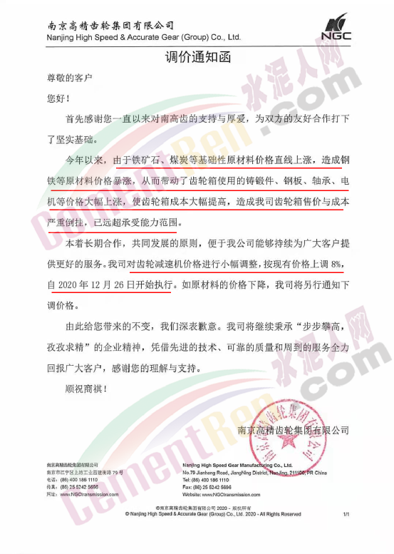 在剛剛過去的春節長假,大宗商品市場頗不平靜,油脂類產品也出現大幅的大調。南京高精齒輪集團有限公司調價通知稱,今年以來,由于鐵礦石、煤炭等基礎性原材料價格直線上漲,造成鋼鐵等原材料價格暴漲,從而帶動了齒輪箱使用的鑄鍛件、鋼板、軸承、電機等價格大幅上漲,使齒輪箱成本大幅提高,造成公司齒輪箱售價與成本嚴重倒掛,已遠超承受能力范圍。本著長期合作,共同發展的原則,便于公司能夠持續為廣大客戶提供更好的服務。對齒輪減速機價格進行小幅調整,按現有價格上調8%,自2020年12月26日開始執行。如原材料的價格下降,將另行通知下調價格。