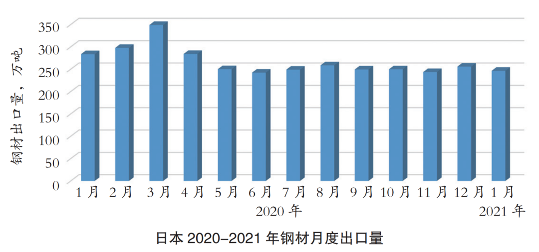 日本鐵鋼連盟數據顯示,日本在2021年1月份出口鋼材246.4萬噸,同比下滑13.1%,連續第九個月下降。其中,普通鋼材出口量為164.6萬噸,同比減少13.0%,亦為連續第九個月下降。