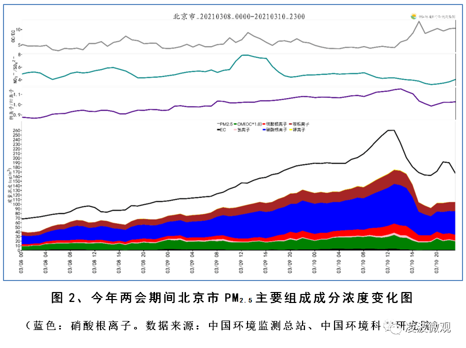 環境監測總站的數據顯示,今年兩會期間北京發生霧霾時大氣中升高的PM2.5仍主要是硝酸鹽。3月9日北京市PM2.5組分以硝酸鹽為主,占全部PM2.5的50%以上,見下圖2所示。