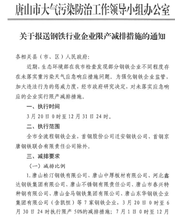 在減排比例上:唐山松汀鋼鐵有限公司、唐山中厚板材有限公司、河北鑫達鋼鐵集團有限公司、唐山不銹鋼有限責任公司、唐山市春興特種鋼有限公司、唐山金馬鋼鐵集團有限公司、唐山東華鋼鐵企業集團有限公司(含凱恒)等7家鋼鐵企業,3月20日0時至6月30日24時執行限產50%的減排措施;7月1日0時至12月31日24時執行限產30%的減排措施。其余16家鋼鐵企業,3月20日0時至12月31日24時執行限產30%的減排措施。