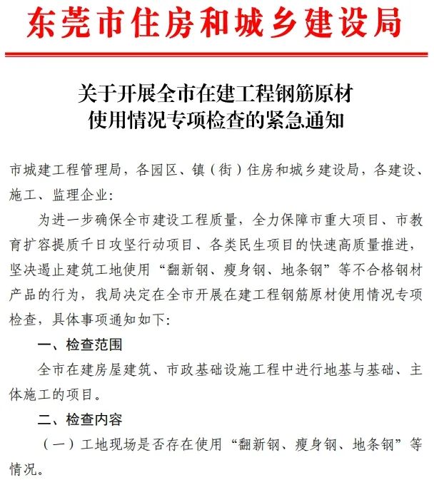 為進一步確保全市建設工程質量,全力保障市重大項目、市教育擴容提質千日攻堅行動項目、各類民生項目的快速高質量推進,堅決遏止建筑工地使用“翻新鋼、瘦身鋼、地條鋼”等不合格鋼材產品的行為,市住建局決定于3月16日至3月19日,在全市開展在建工程鋼筋原材使用情況專項檢查。