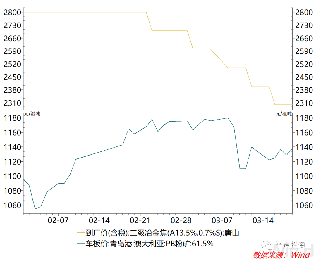 至今,一個季度過去了,從節前的高點至今,鋼鐵生產的另一主要原料焦炭的價格下跌了超過20%,而鐵礦價格不僅不跌,反而高于春節前。