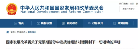 2021年5月6日上午,國家發展改革委發表了《國家發展改革委關于無限期暫停中澳戰略經濟對話機制下一切活動的聲明》。聲明提出,基于澳聯邦政府當前對中澳合作所持態度,國家發展改革委決定,自即日起,無限期暫停國家發展改革委與澳聯邦政府相關部門共同牽頭的中澳戰略經濟對話機制下一切活動。