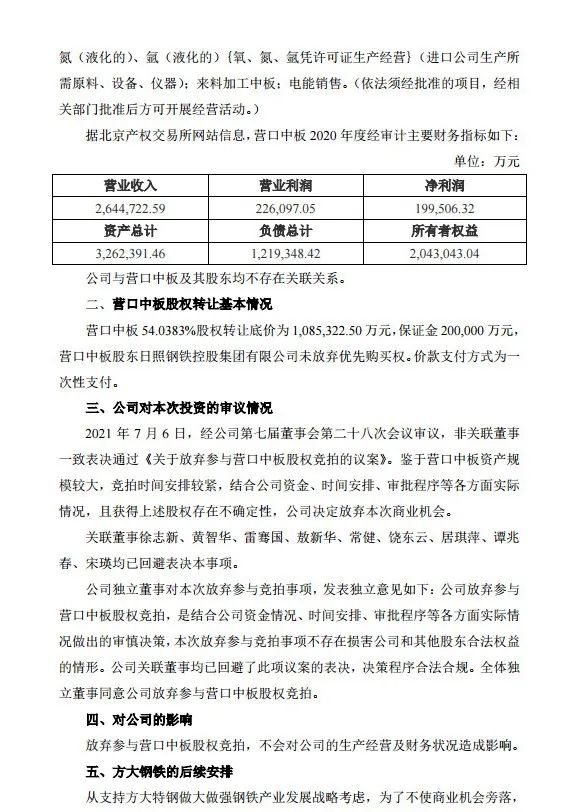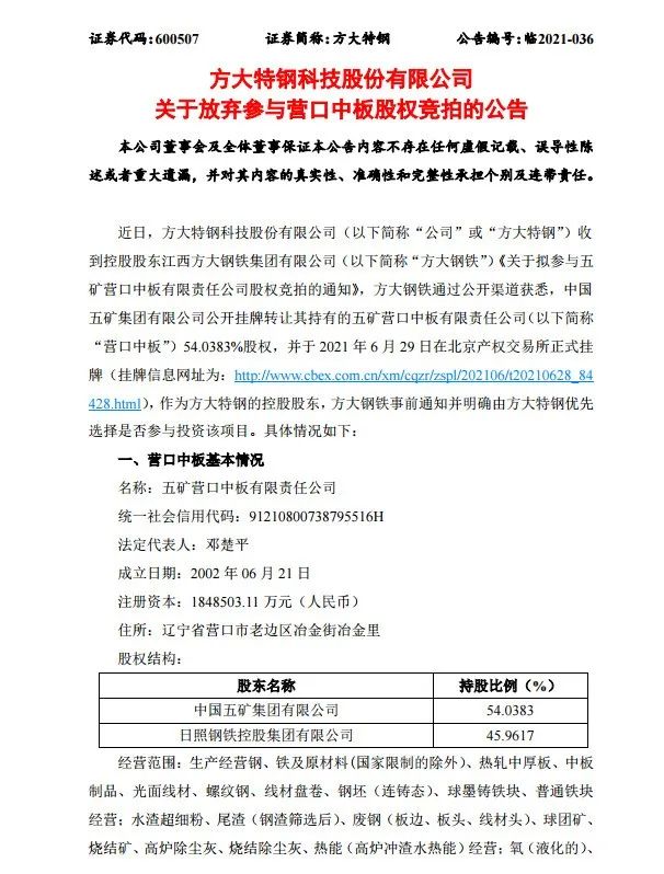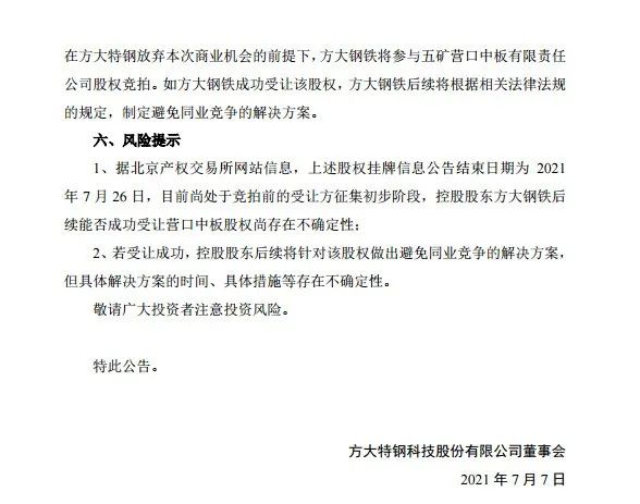 2021年7月7日,方大特鋼發布公告,從支持方大特鋼做大做強鋼鐵產業發展戰略考慮,為了不使商業機會旁落, 在方大特鋼放棄本次商業機會的前提下,方大鋼鐵將參與五礦營口中板有限責任公司股權競拍。如方大鋼鐵成功受讓該股權,方大鋼鐵后續將根據相關法律法規的規定,制定避免同業競爭的解決方案。
