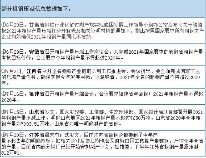 2021年上半年,鋼鐵去產(chǎn)能“回頭看”檢查工作陸續(xù)落地。2021年6月起,各省市傳出粗鋼產(chǎn)量減量任務(wù)相關(guān)信息,但正式出臺的文件很少。