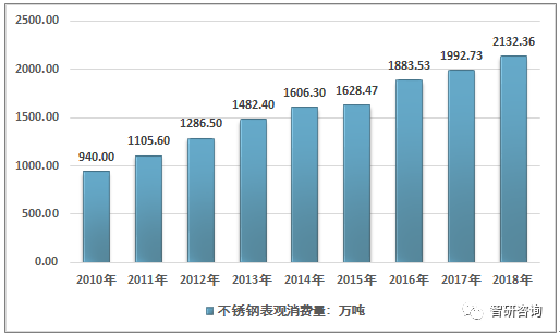近幾年我國宏觀經濟走勢總體穩定,不銹鋼的需求量也保持較為穩定的增長態勢,表觀消費量保持穩定增長。2018年我國不銹鋼表觀消費量2132.36萬噸,同比增加139.63萬噸,增長7.01%,增速較2017年有所提升,主要2018年由于工程機械市場迅速增長推動了不銹鋼需求量的上升。