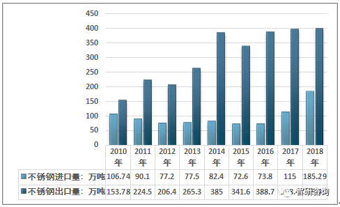 進出口方面,據海關數據顯示,2018年我國進口不銹鋼185.29萬噸,同比增加64.78萬噸,增長53.76%;出口不銹鋼399.45萬噸,同比增加5.27萬噸,增長1.34%。
