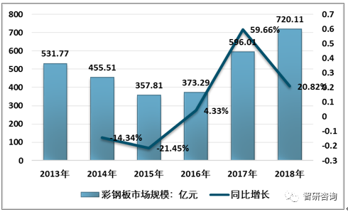 過去我國彩鋼行業市場結構主要集中在低端產品,近年來隨著我國經濟的快速發展,下游需求對于彩鋼板需求的重心從“量”往“質”的方面轉變。彩鋼行業被迫進行產業升級,在行業重新洗牌和升級的過程中,市場規模出現顯著的下滑。直到2016年,行業市場規模重新回歸上升軌道。