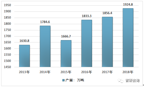 2018年我國彩鋼板行業產量約1924.8萬噸,同比2017年的1856.4萬噸增長了3.68%,近幾年我國彩鋼板行業產量情況如下圖所示: