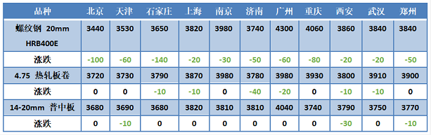 三、行情預判隨著期貨鋼價的高位回落,現貨報價進一步松動。日內華北地區建材跌幅明顯,需求端受到雨雪天氣的影響呈現下行壓力,貿易商積極出貨,南方市場因北材集中到貨整體走弱。同時,隨著空氣擴散條件的好轉,多地區解除重污染預警,本周增產壓力加大,鋼價下行難改,預計建材跌幅將大于板材。(來源:中鋼網)