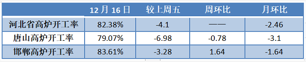 隨著期貨的拐頭向下,鋼材現貨報價進一步下調。日內建材跌幅加大,華北地區最大跌幅超100,板材穩中部分市場也開始下調,熱卷跌幅10-40。鋼坯自12月8日以來持續下跌,至12月17日累跌120至3340元/噸;唐山地區今日解除重污染應急響應,本周增產壓力加大,鋼價將繼續下跌;期貨自昨日高位回落之后,繼續下行。期螺下跌28收報3484,下方3450有支撐,日線圖中MACD動能柱已縮減至0軸,整體偏弱,螺紋短時震蕩,后市仍有下跌空間。熱卷下跌13收報3540,形態上收出一根下影線較長的錘子線,說明該位置獲得買盤支撐,下跌受阻,走勢強于螺紋。現貨方面:螺紋鋼普跌,且跌幅擴大,全國主要市場下跌20-140,華北地區跌幅較大,均價下調39;熱卷穩中部分下跌10-40,均價下調6;中板持穩,均價下調1。全國24個主要市場螺紋鋼 20mm HRB400E平均價格3899元/噸,較上個交易日下調39元/噸。全國24個主要市場4.75 熱軋板卷平均價格3877元/噸,較上個交易日下調6元/噸。全國23個主要市場14-20mm 普中板平均價格3815元/噸,較上個交易日下調1元/噸。12月17日,唐山政府下發關于解除重污染天氣Ⅱ級應急響應的通知,根據通知內容,12月17日起,受冷空氣影響擴散條件逐步改善,污染過程基本結束,自12月17日12時起全市解除重污染天氣Ⅱ級應急響應。此次環保限產從12月13日起執行,共計4日。同時,山西省臨汾市也于12月16日24時起解除了重污染天氣橙色預警。成都于12月16日零時起由橙色預警降級為黃色預警。根據監測數據,河北高爐開工率有所回落,但仍然保持在80%以上,隨著重污染預警的解除,本周增產壓力會隨之增加。距離新年不到半個月時間,需求回落壓力加大。尤其是建材,通常正常施工時間為3月15日至11月15日,其余時間作為冬季施工,北方地區會因為添加防凍液等措施增加額外的養護費用,冬季需求回落是大趨勢。目前東北地區工地已基本停工,華北、西北地區需求和運輸也受到雨雪天氣影響面臨下降壓力,進入12月末至1月初,各地運輸將逐步停運,這也就意味著今年的行情將告一段落。而從近期的成交數據來看,相較11月,市場成交整體下行。且目前冬儲因價格高位仍沒有規模化開啟,貿易商采購謹慎,積極出貨。而這一心態很可能持續到年底。