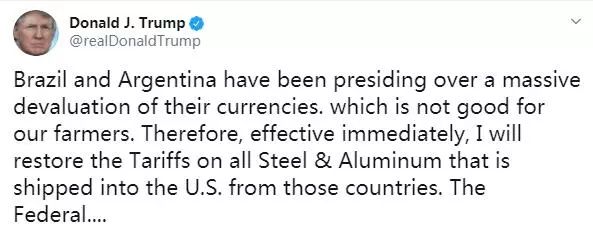 特朗普在推文中將他的貿(mào)易政策與美聯(lián)儲聯(lián)系在一起,“這兩個南美國家一直在主導本國貨幣的大規(guī)模貶值。這對我們的農(nóng)民沒有好處。因此,我將恢復所有從這些國家運往美國的鋼鐵和鋁的關稅。”