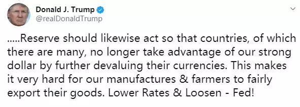 特朗普稱,美聯(lián)儲應該采取行動,這樣那些國家不能通過貶值貨幣來利用強美元獲得優(yōu)勢。這使得我們的制造商和農(nóng)民很難公平地出口他們的產(chǎn)品。