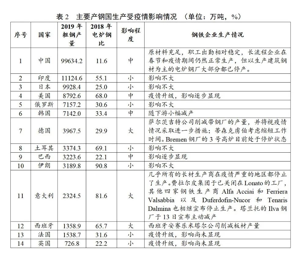 2020年前兩個月,中國生鐵產(chǎn)量同比增長3.1%。隨著全球疫情的惡化,3月份及以后下游市場需求減少的影響將逐步顯現(xiàn),冶金工業(yè)規(guī)劃研究院預(yù)測,全年生鐵產(chǎn)量7.45億噸,同比下降8%。2019年日本生鐵產(chǎn)量同比下降3.1%。雖然之前日本對疫情控制得較好,但隨著國內(nèi)外市場需求降低,鋼材出口將受到較大影響。日本制鐵已關(guān)閉500萬噸產(chǎn)能的吳鋼廠,合并停產(chǎn)4座高爐。韓國浦項制鐵已開始對1座4600m3高爐大修,預(yù)計6月初恢復(fù)生產(chǎn),短期影響生鐵產(chǎn)量約7%,不排除中遠期再實行減產(chǎn)計劃。2019年歐盟生鐵產(chǎn)量同比下降4.2%,今年1~2月份,歐盟經(jīng)濟增長預(yù)期不佳,繼續(xù)延續(xù)了下降趨勢,同比下降9.8%。疫情爆發(fā)后又導(dǎo)致多家汽車制造企業(yè)停產(chǎn),未來生鐵產(chǎn)量和鐵礦石需求將進一步下降。2019年美國生鐵產(chǎn)量同比下降7.6%,2020年1~2月產(chǎn)量繼續(xù)大幅下降12.8%,美國疫情影響還在不斷擴大,預(yù)計生鐵產(chǎn)量和鐵礦石需求量將延續(xù)下降態(tài)勢。國內(nèi)疫情對煉焦煤生產(chǎn)影響已基本消失。國內(nèi)煤礦的陸續(xù)復(fù)產(chǎn),保障了市場主要供應(yīng),國內(nèi)除湖北省,基本達到去年同期生產(chǎn)水平。澳大利亞、蒙古、俄羅斯等煉焦煤主要出口國受疫情影響較小,煤炭供貨充足。受疫情、環(huán)保及原料供應(yīng)偏緊等因素制約,2020年1~2月國內(nèi)焦炭生產(chǎn)出現(xiàn)大幅下滑,焦炭產(chǎn)量7064.1萬噸,同比減少5.5%。預(yù)計全年焦炭產(chǎn)量約4.7億噸,同比減少6.6%,對應(yīng)煉焦煤(精煤)需求約5.8億噸。同時,煉焦煤進口國日本和韓國受疫情影響,后續(xù)煉焦煤需求也將減少。因此,煉焦煤需求整體會下滑,價格下滑壓力也較大。鋼鐵工業(yè)以長流程為主,全球平均電爐鋼產(chǎn)量占比約30%。在疫情影響下,長流程需要連續(xù)生產(chǎn),停產(chǎn)的可能性較小,部分企業(yè)可能會由于原料供應(yīng)不足和下游市場萎縮進行一定幅度減產(chǎn)。根據(jù)世界鋼協(xié)數(shù)據(jù),2020年1~2月全球粗鋼產(chǎn)量同比增加1.0%,其中海外粗鋼產(chǎn)量同比減少1.8%,世界主要產(chǎn)鋼國粗鋼生產(chǎn)受疫情影響見表2。