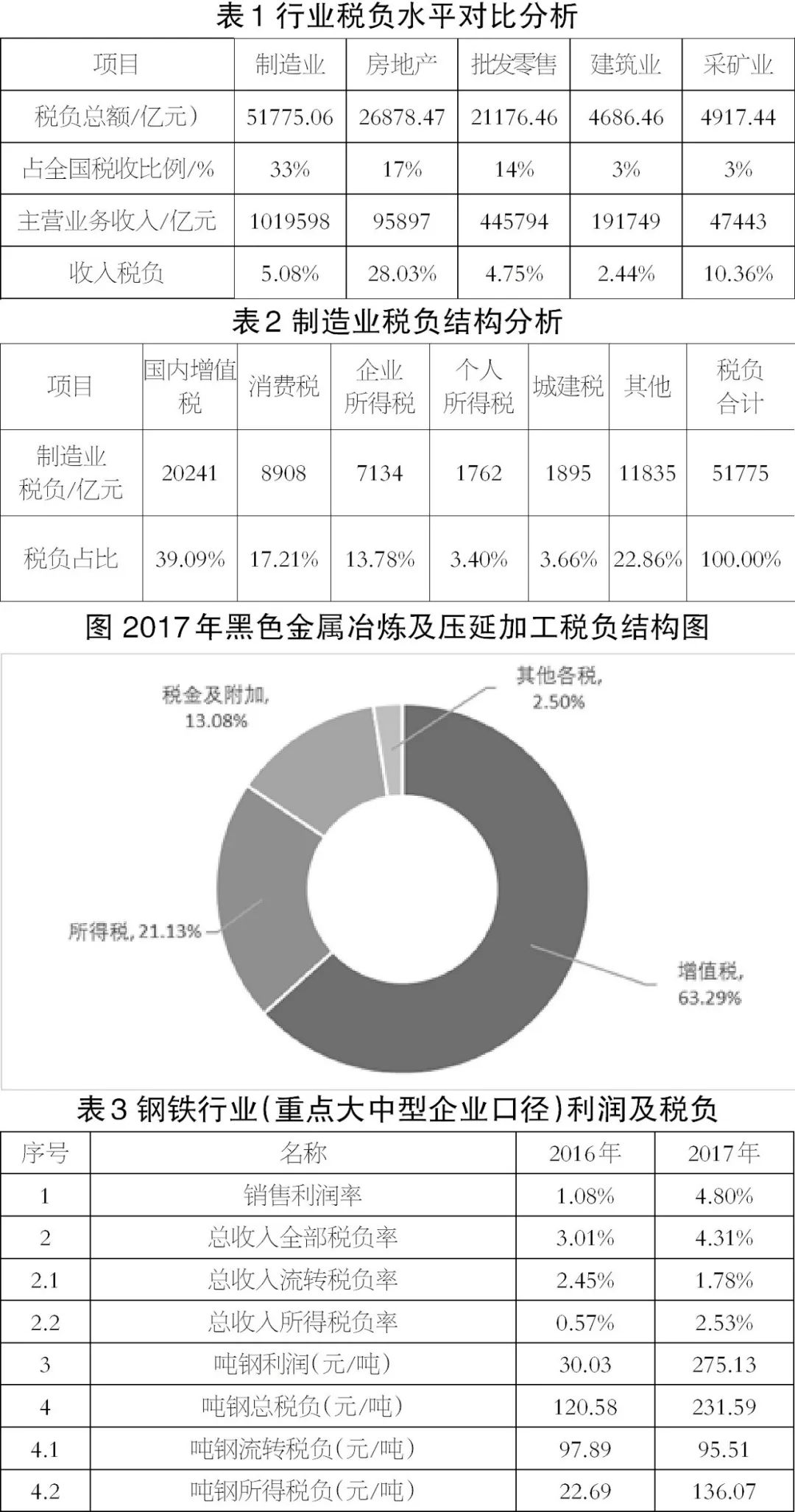 鋼鐵工業(yè)是國(guó)民經(jīng)濟(jì)中的重要組成部分,也是向國(guó)家上交稅金最多的行業(yè)之一。2017年重點(diǎn)大中型鋼鐵企業(yè)累計(jì)實(shí)現(xiàn)工業(yè)增加值6143.88億元,占同期全國(guó)GDP的0.75%;實(shí)現(xiàn)稅金1604.57億元,占同期國(guó)家稅收的1.11%。鋼鐵工業(yè)作為國(guó)家支柱產(chǎn)業(yè),在經(jīng)濟(jì)建設(shè)、社會(huì)發(fā)展、財(cái)政稅收、國(guó)防建設(shè)以及穩(wěn)定就業(yè)等方面發(fā)揮著重要作用,對(duì)保障國(guó)民經(jīng)濟(jì)又好又快發(fā)展做出了重要貢獻(xiàn),在發(fā)展過(guò)程中,稅負(fù)重、利潤(rùn)不高等問(wèn)題制約行業(yè)健康發(fā)展,因此,在公平、合理稅負(fù)問(wèn)題上有值得研究和進(jìn)一步改革的必要。