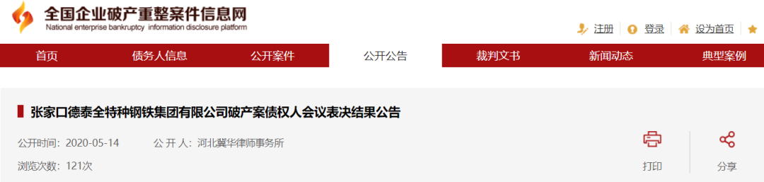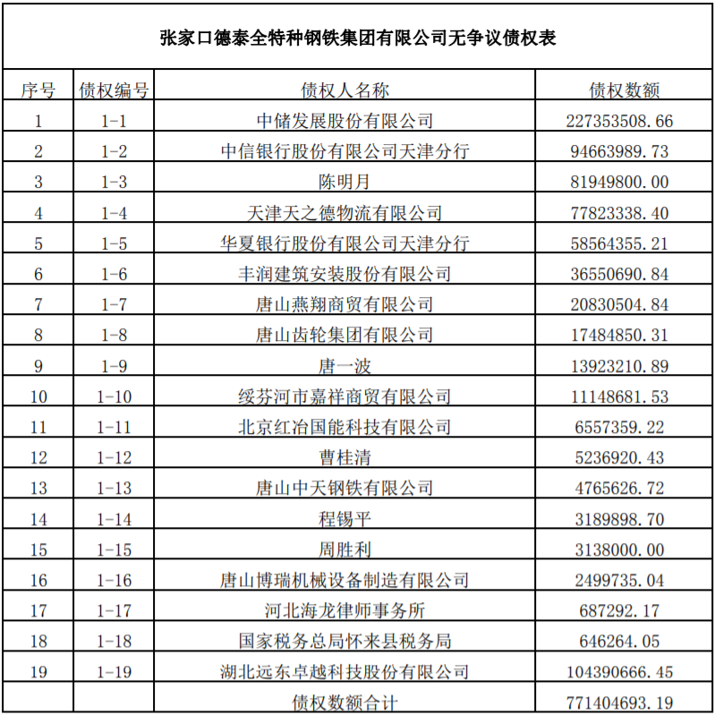 張家口德泰全特種鋼鐵集團有限公司破產清算案債權人會議由河北省張家口市中級人民法院召集于2019年2月22日在張家口市懷來縣懷來賓館召開,指定中儲發展股份有限公司擔任債權人會議主席。2019年5月27 日,在張家口市中級人民法院,由債權人會議主席中儲發展股份有限公司李殿安主持、債權人會議主席指定的程錫平、付景龍兩名監票人監督下,就有表決權的債權人對債權人委員會成員選舉、債權核查、債權人委員會議事規則、債務人財產變價(處置)初方案、債務人財產分配初方案的郵寄的表決票現場開封、現場進行了統計并對統計結果進行了簽字確認。 表決確認的結果如下: 一、債權核查結果 提交表決票的有表決權的債權人共計18人(唐山燕翔商貿有限公司債權轉讓給唐山齒輪集團有限公司,該兩筆債權合并按一筆計),管理人收到選票為18票。 對管理人已認定債權表中記載的19筆債權,除國家稅務總局懷來縣稅務局對自己的債權646264.05元提出異議外,其他債權均無人表示異議。 對管理人不認定債權24筆,無異議的共23人;對不認定結論有異議的有1人,為周勝利對不認定王國紅債權1385252.40元提出異議,理由為該案正在再審中。 對暫不認定債權表中記載的債權無人提出異議。 二、債權人委員會成員選舉結果 提交表決票的有表決權的債權人共計18人(唐山燕翔商貿有限公司債權轉讓給唐山齒輪集團有限公司,該兩筆債權合并按一筆計),管理人收到選票為18票,選舉結果為無人通過法定半數,本次選舉未產生債權人委員會成員。 三、《債權人委員會議事規則》表決結果 提交表決票的有表決權的債權人共計18人(唐山燕翔商貿 有限公司債權轉讓給唐山齒輪集團有限公司,該兩筆債權合并 按一筆計),管理人收到表決票為18票,同意《債權人委員會 議事規則》的有17票,占有表決權的債權人人數的94.44%,其債權數額占無財產擔保債權總額的86.47%;不同意該規則的有1票,其債權數額占無財產擔保債權總額的13.53%。同意該規則的已過法定半數。 經投票表決,通過《債權人委員會議事規則》。 四、《債務人財產變價(處置)初方案》表決結果 提交表決票的有表決權的債權人共計18人(唐山燕翔商貿 有限公司債權轉讓給唐山齒輪集團有限公司,該兩筆債權合并 按一筆計),同意《債務人財產(處置)初方案》的有16人, 占有表決權的債權人人數的88.89%,其債權數額占無財產擔保債權總額的78.88%;不同意該方案的有2人,其債權數額中無財產擔保債權總額的21.12%。同意該初方案的已過法定半數。 經投票表決,通過《債務人財產變價(處置)初方案》 五、《債務人財產分配初方案》表決結果 提交表決票的有表決權的債權人共計18人(唐山燕翔商貿3有限公司債權轉讓給唐山齒輪集團有限公司,該兩筆債權合并 按一筆計),同意《債務人財產分配初方案》的有14人,占有表決權的債權人人數的77.78%,其債權數額占無財產擔保債權總額的80.7%;不同意該方案的有4人,其債權數額占無財產擔保債權總額的19.3%。同意該初方案的已過法定半數。 經投票表決,通過《債務人財產分配初方案》。根據《中華人民共和國企業破產法》第六十四規定,本次會議就上述議題作出決議如下: 1. 通過《債權人委員會議事規則》,管理人嚴格按方案執行; 2. 通過《債務人財產變價(處置)初方案》; 3. 通過《債務人財產分配初方案》。 債權人認為債權人會議的決議違反法律規定,損害其利益的,可以自債權人會議作出決議之日起十五日內,請求人民法 院裁定撤銷該決議,責令債權人會議依法重新作出決議。 債權人會議的決議,對于全體債權人均有約束力。 特此公告。