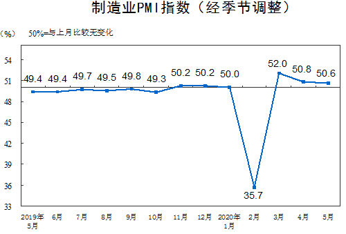 5月中國制造業采購經理指數PMI50.6%,比上月回落0.2個百分點。連續三個月處于榮枯線50%以上,反應國內制造業的持續恢復,但隨著基數的擴大,制造業恢復速度放緩。同時,5月財新制造業PMI回升至50.7,疫情過后首次進入擴張區間。