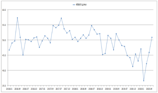中物聯鋼鐵物流專業委員會數據顯示,5月鋼鐵行業PMI為50.9%,較上月上升5個百分點,也是疫情以來首次回升至榮枯線50%以上,進入擴張區間。