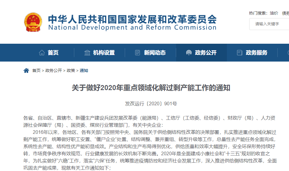 2020年是全面建成小康社會和“十三五”規(guī)劃的收官之年,為扎實做好“六穩(wěn)”工作,落實“六保”任務(wù),統(tǒng)籌推進(jìn)疫情防控和經(jīng)濟(jì)社會發(fā)展工作,深入推進(jìn)供給側(cè)結(jié)構(gòu)性改革,全面鞏固去產(chǎn)能成果,6月12日國家發(fā)改委發(fā)布《關(guān)于做好2020年重點領(lǐng)域化解產(chǎn)能工作的通知》。