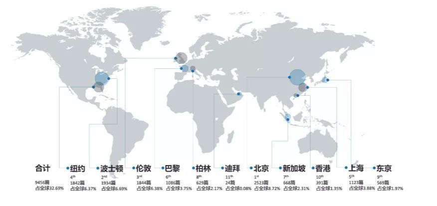 其中,北京擁有2523篇高被引文獻,占全球8.72%,排名第一。排在前5位的還有:波士頓、倫敦、紐約和上海。