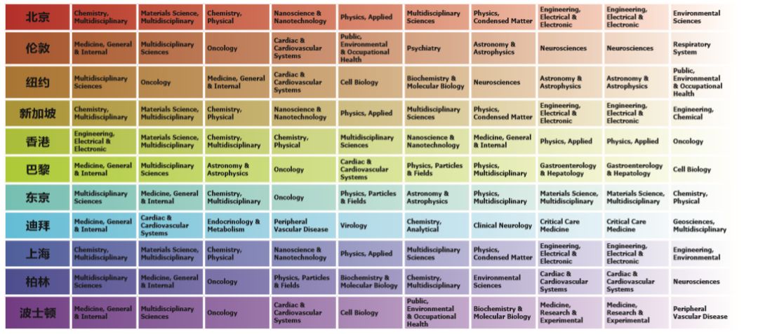 各代表性城市產出的高被引論文分布TOP 10的學科類別,共38個重點學科分類
