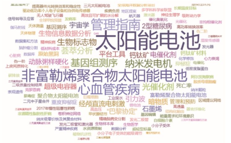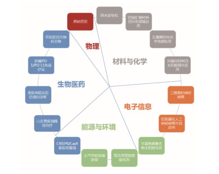 綜合判定的15個科技創新策源點分別為:納米發電機、非富勒烯聚合物太陽能電池、光催化材料的太陽能轉化應用、高負荷高能鋰硫電池、鈣鈦礦類材料的光電領域應用、CRISPR/Cas9基因組編輯、心血管疾病精準治療、腫瘤PD-1/PD-L1免疫療法、抑郁癥的生物標志物、路易體癡呆癥的鑒別診斷、三維卷積神經網絡、石墨烯的電化學傳感應用、憶阻器在人工神經網絡中的應用、大氣甲烷濃度劇變、原始黑洞。
