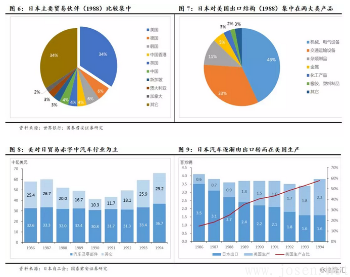 就行業而言,汽車行業成為美日貿易摩擦的焦點。以1988年為例,美國是日本最大貿易伙伴,占日本進出口總額比重高達34%(圖6),日本對美國出口中,機械、電氣設備和交通運輸設備占出口總額的近80%,是日本對美國出口的主要產品(圖7)。汽車產業作為日美貿易中逆差貢獻最大的產業(圖8),也是當時貿易摩擦的焦點,美日貿易戰對其影響巨大。美國要求日本先后實施了對美汽車出口限額、擴大日本市場對美國汽車企業開放等措施。此后,美國本土生產的日本汽車數量在總出售給美國的日本汽車數量的比重不斷上升,1986年占比不到15%,而在1994年卻接近60%。日本汽車企業加強在美國生產線布局,生產線向美國轉移,生產趨于本地化(圖9)。